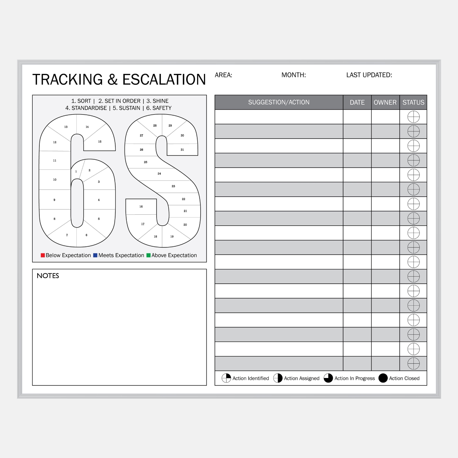 6S Tracking & Escalation Board – Visual Performance Management Whiteboard