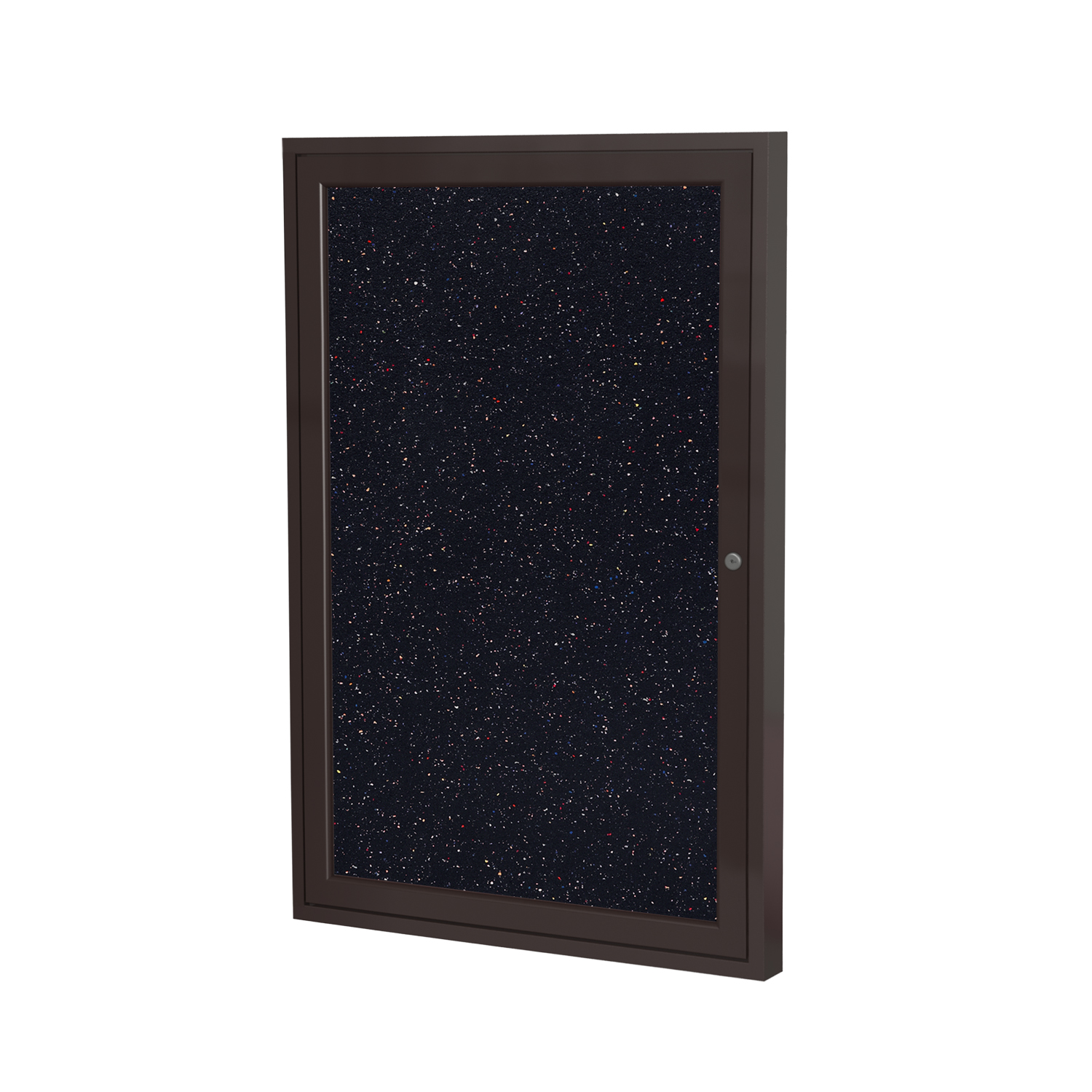 Eco-friendly enclosed recycled rubber bulletin board with self-healing surface, shatter-proof doors, and secure lock, available in aluminum or wood frames.