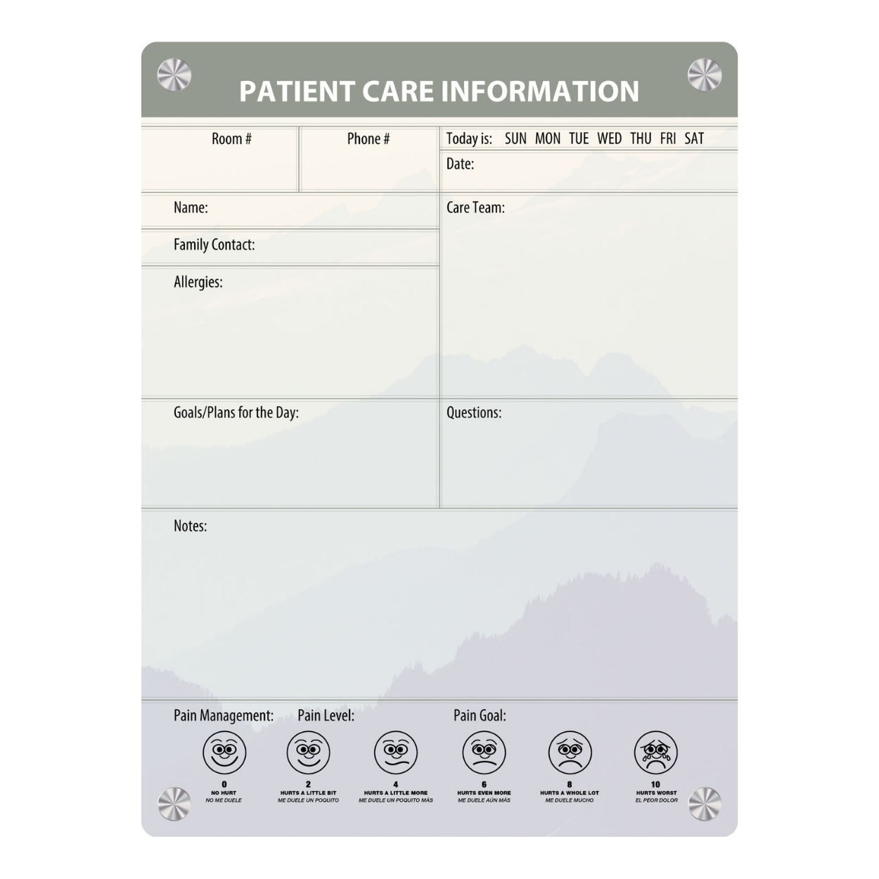 - Graphic patient room whiteboard designed to promote healing and care in a hospital environment