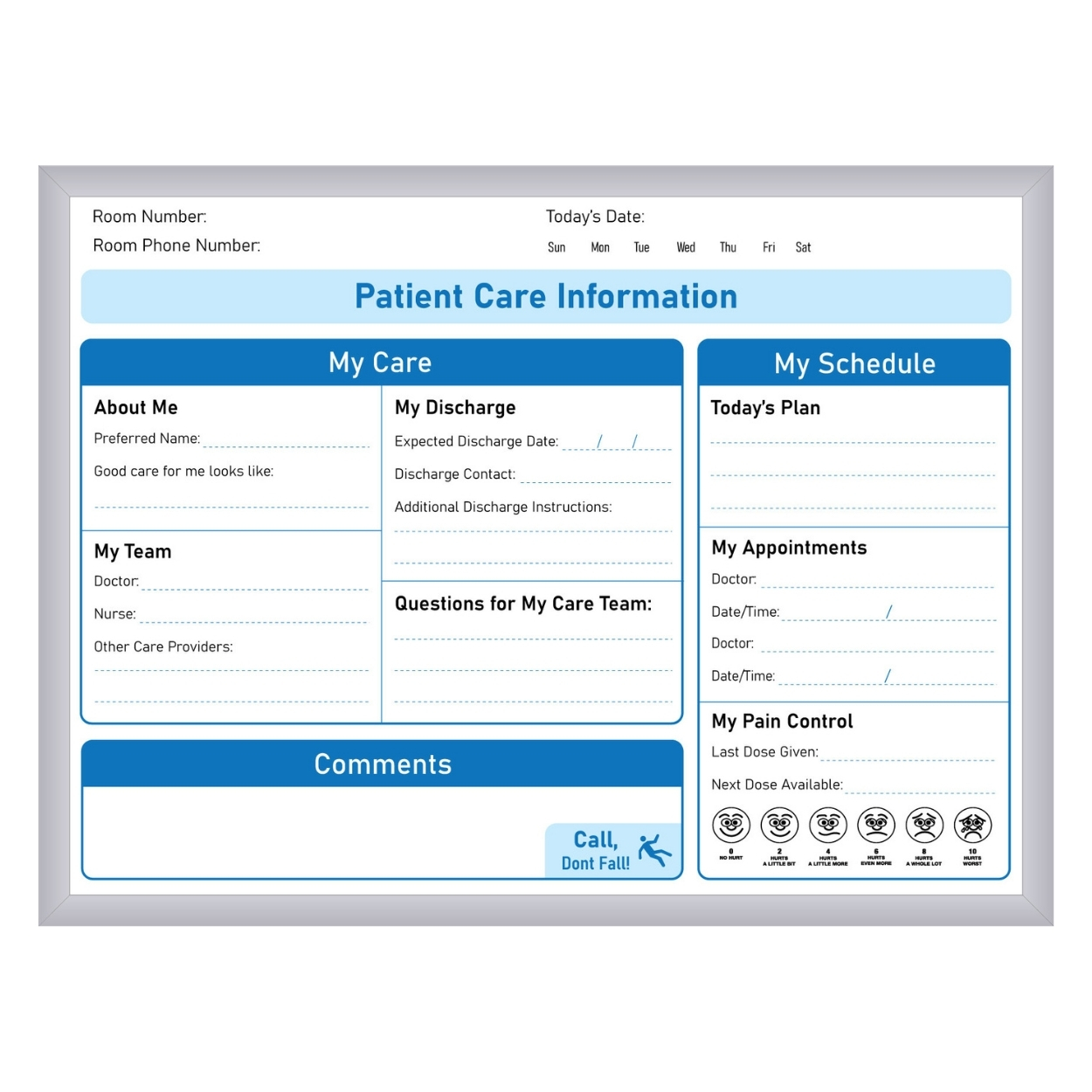 Designed to actively involve patients in their care, this patient room whiteboard emphasizes schedules, appointments, pain control, and care coordination.