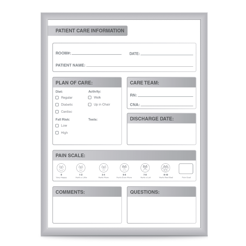 The Patient Room Whiteboard is a thoughtful communication tool designed specifically for healthcare environments where clarity, cleanliness, and collaboration matter. Built to support caregivers, patients, and families alike, this whiteboard provides a dependable surface for displaying critical information, improving communication, and enhancing the patient’s experience.