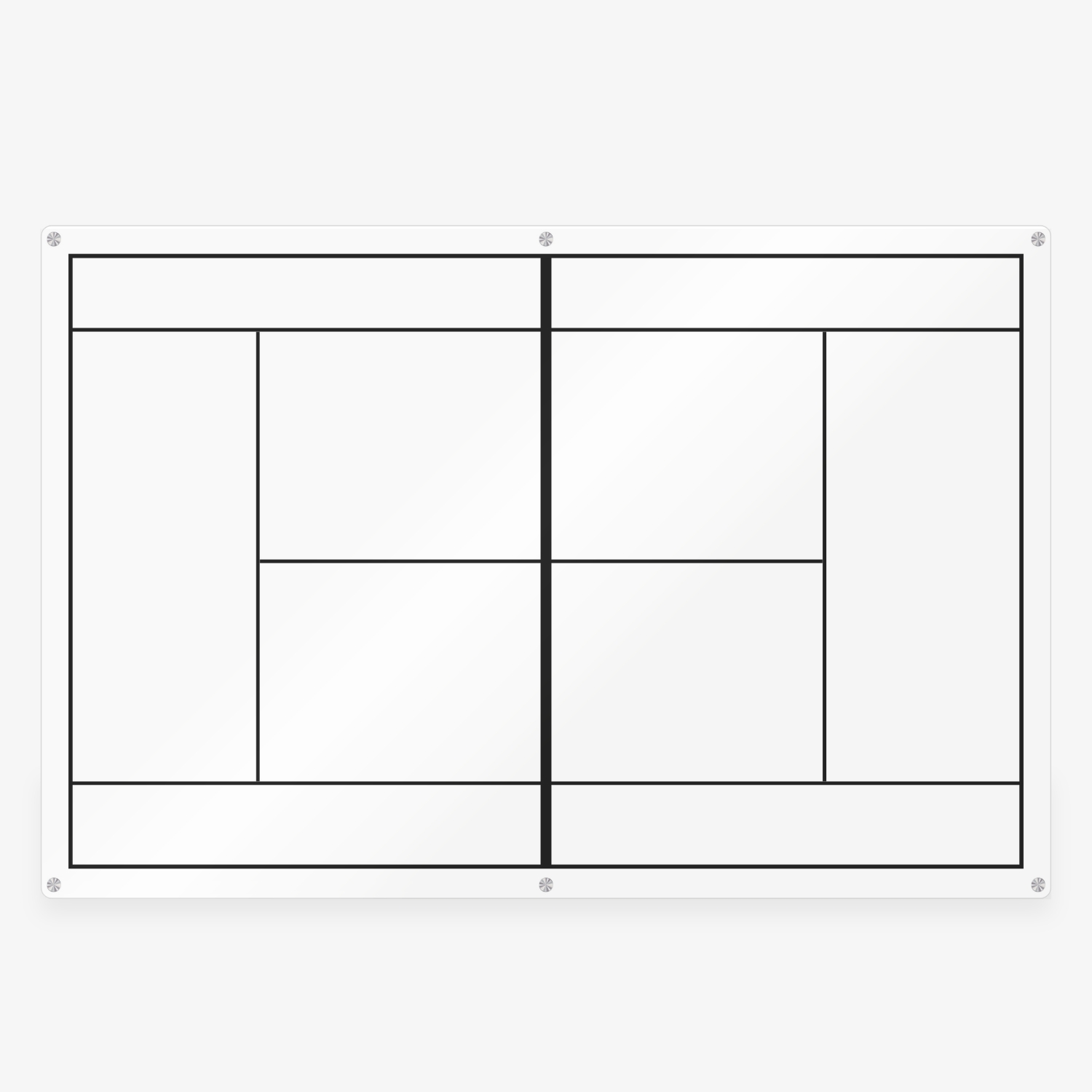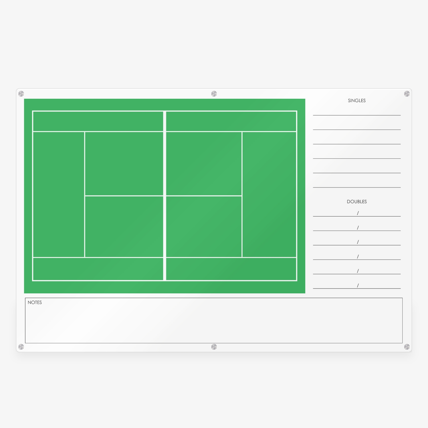 Full tennis court glass whiteboard for coaching, training, and match planning. Perfect for illustrating positioning, shot strategy, and player movement.